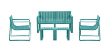 Elaborado en Polipropileno el set incluye mesa centro, dos sillas y un banco, en Color Azul Marino